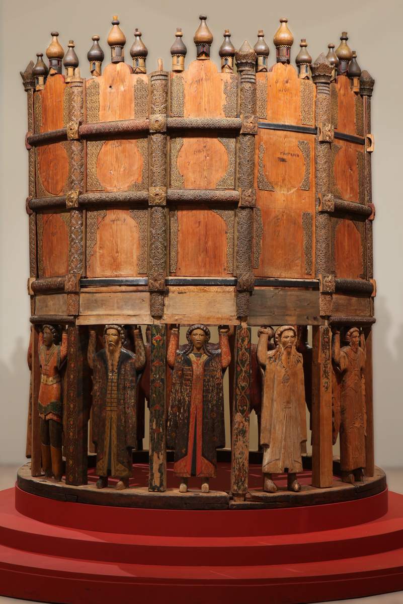 Новгородский амвон представляет собой круглое в плане архитектурное сооружение. В трех верхних ярусах первоначально располагались иконы с изображениями святых. Нижний ярус-основание образуют фигуры, размещенные по кругу. Роскошь орнаментального убора верхних ярусов амвона гармонирует с живописно-пластическим совершенством нижнего регистра, в котором, возможно, находились образы святых.